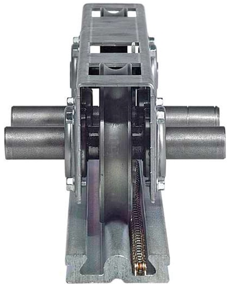 Bei dem mechanischen und elektrischen Antrieb wird die Kraft wahlweise durch ein Reibrad oder ein Kettenrad mit Kette in der Laufschiene über torsionssteife Wellen übertragen (Bild 2). Mit einer exakten Parallelführung und doppelt kugelgelagerten Laufrädern mit 130 mm Durchmesser ist ein hoher Bedienkomfort bei geringstem Kraftaufwand gewährleistet.